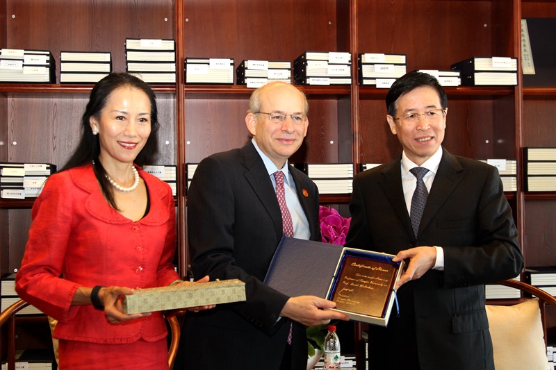名誉教授授予仪式于10月2日上午在郑东图书馆日新书斋举行,校长李家俊出席授予仪式,校长助理胡文平、法学院院长孙佑海教授、人文社科处处长张俊艳等参加了授予仪式,仪式由国际合作与交流处处长杨福玲主持。张俊艳教授介绍了Leebron教授的学术背景和学术成就,李家俊为Leebron教授颁发了名誉教授荣誉证书及木牌。Leebron教授表示他非常珍视天津大学授予的荣誉,也很兴奋今天能加入天津大学的教师队伍,他将努力为天津大学法学院的发展做出贡献,并在未来积极促进中美高校之间的合作。莱斯大学代表团成员还包括Leebron教授的夫人孙悦萍博士、校长助理David Vassar博士。