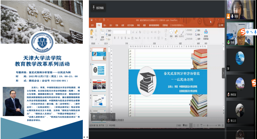 (通讯员 蓝蓝)12月17日晚,鉴定式案例分析方法第二场培训活动顺利举行。本次讲座采用线上方式,邀请到的主讲嘉宾是中南财经政法大学法学院教授、博士生导师李昊,他主讲的题目是:鉴定式案例分析管窥:以民法为例”。李昊教授多年来一直在国内高校间积极推行鉴定式案例教学方法,为鉴定式案例教学的普及和推广作出了重要贡献。