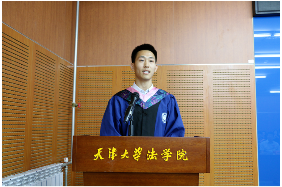 2020届研究生毕业生代表刘杰发言,他代表全体毕业生向学院领导和各位老师的陪伴和付出表示衷心的感谢和崇高的敬意。2020届研究生见证了法学院复建以来为培养新时代法治人才所付出的努力,更见证了学院在新法科建设道路上所取得的累累硕果,每一位老师和同学都为此感到骄傲和自豪。毕业总是伴随着不舍,时光匆匆而逝,即将与天大道别,迎接自己的人生新征程,他号召大家谨记“实事求是”的校训,秉承“崇法厚德、致公天下”的操守,做勇于担当、具有家国情怀的“天大人”。最后他为同学、为老师、为学院、为母校、为祖国送上真挚的祝福。