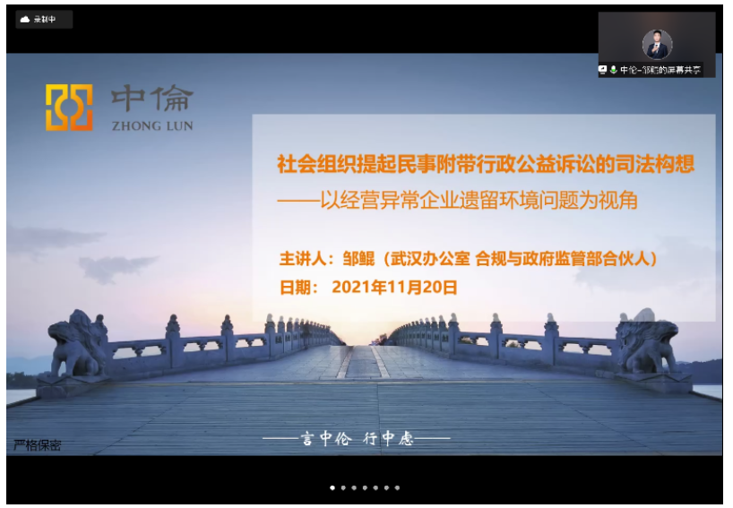 北京中伦(武汉)律师事务所廖宇程律师代表邹鲲律师以“社会组织提起民事附带行政公益诉讼的司法构想——以经营异常企业活动环境问题为视角”为主题进行分享。他分析了民事附带行政公益诉讼适格主体问题,并提出,在民事附带行政公益诉讼中应当明确预防性责任、恢复性责任、人格恢复性责任、赔偿性责任等责任。