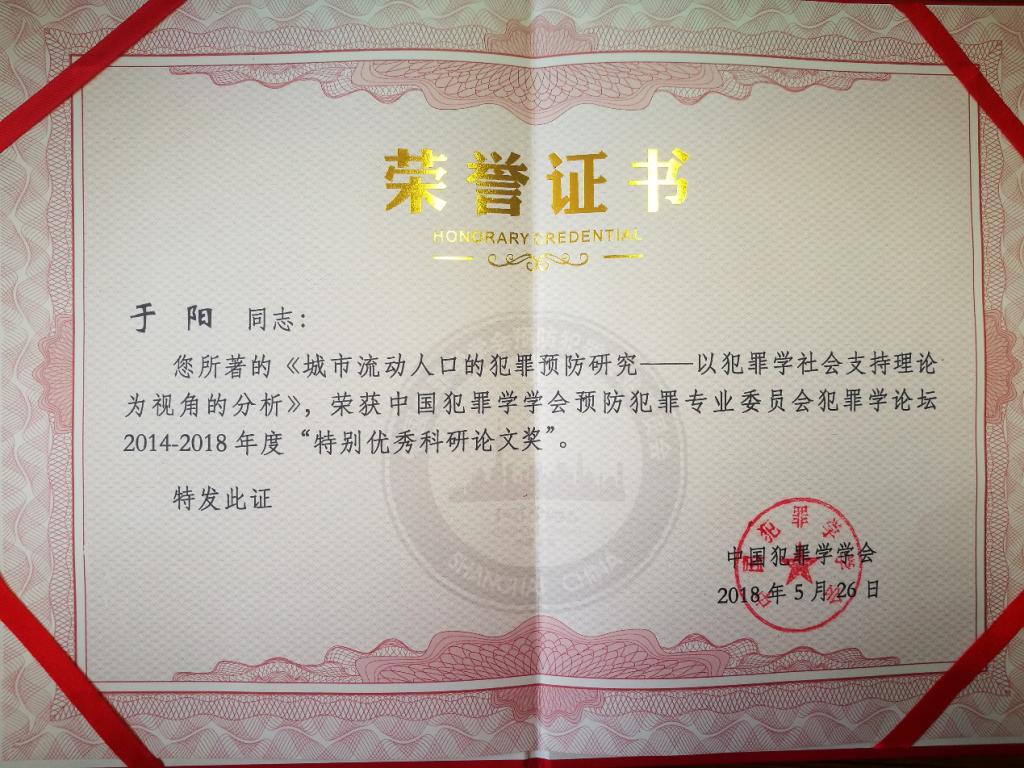 本届论坛开始前,由组委会邀请国内外知名犯罪学专家学者,就五届论坛所收录的600余篇学术论文进行学术评议。最终评选出8篇论文,由中国犯罪学学会颁发犯罪学论坛2014-2018年度“特别优秀科研论文奖”。于阳副教授题为《城市流动人口的犯罪预防研究——以犯罪学社会支持理论为视角的分析》的论文获此荣誉。