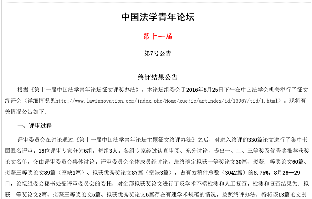 中国法学青年论坛是中国法学会主办的三大论坛之一。本次论坛拟于2016年11月在北京举行,主题为“互联网治理与法治发展”,共有3042篇有效论文投稿,从中共选出一等奖30篇,二等奖58篇,三等奖84篇,优秀奖81篇。组委会将以中国法学会的名义,对获奖论文作者颁发荣誉证书,并邀请中央有关部门的领导同志在中国法学青年论坛开幕式上进行颁奖。部分一、二等奖获奖作者将被遴选为报告人,在论坛上交流发言。同时,获得一等奖论文且作者或第一作者的年龄未超过40周岁者,自动获得参加第四届“董必武青年法学成果奖”终评的资格。