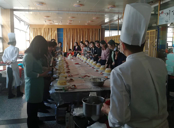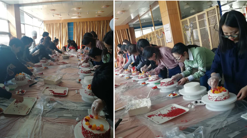 活动邀请慢城烘焙的面点师进行现场教学,主要讲解了如何给蛋糕进行奶油装饰、铺放草莓粒作为点缀,以及用水果做造型,历时一个多小时,最终完成了老师们自己动手制作的蛋糕。