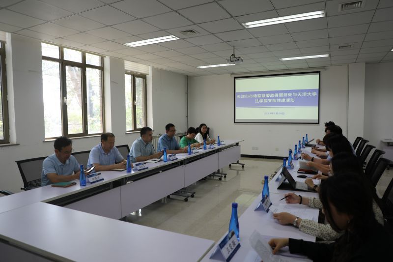 2024年5月28日,天津市市场监管委反不正当竞争处处长(兼政务服务处处长、支部书记)庄健,政务服务处副处长、支部委员刘永超,政务服务处支部委员张伟,反不正当竞争处副处长、支部书记毕思友,反不正当竞争处一级主任科员何茂斌,反不正当竞争处一级科员仇海蛟等一行六人到访天津大学法学院开展联合支部活动。法学院党委书记管虹,副院长、教工第一党支部代表杨健教授,党委副书记杨漫路,教工第二党支部书记薛杨教授,党委组织员、行政党支部书记郭金石,团委副书记、学工办副主任、本科生第二党支部书记张斯琦,学生代表王鑫伟、王雯灏等出席座谈。