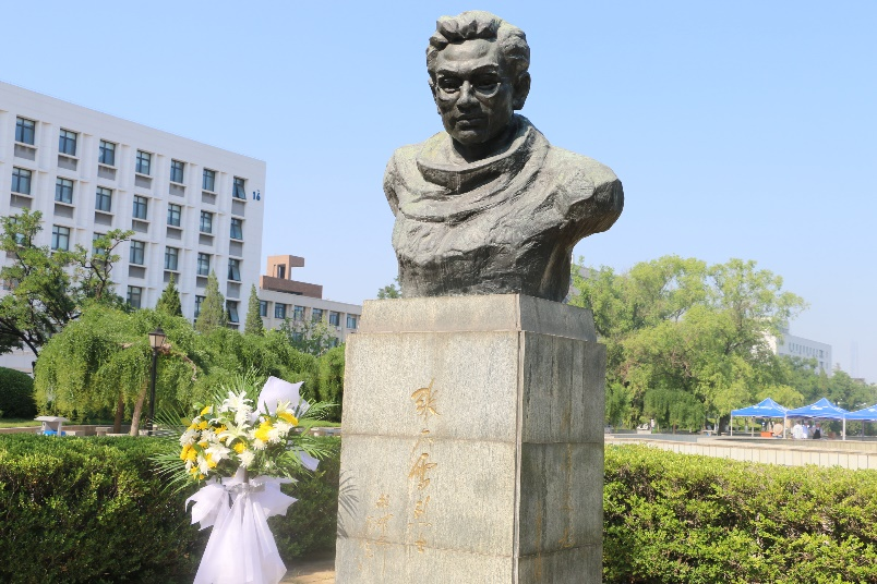 毕业生党员代表、法学院本科生第二党支部副书记葛东欣与新发展党员代表、法学院2022级本科生丁宁为张太雷先烈敬献花篮,表达对太雷同志的追思与敬仰。