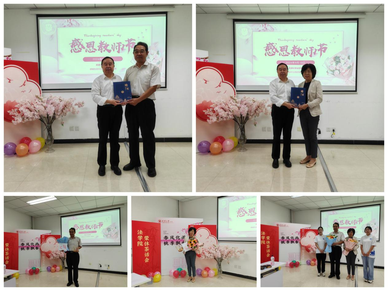 学院第一教研组组长董妍老师和第二教研组组长刘霜老师分别代表教研组向两位荣休教师表达感谢,分享了两位老师为学院和教研组各项工作做出的贡献。青年教师徐文和杨宁讲述了两位荣休教师对青年教师的指导与帮助。学生代表王昕玉向两位荣休教师表达感谢和祝福。吕凯老师和董娟老师分别谈了工作感悟,表达了对学院师生发展的关心,以及继续为学院事业发展做贡献的愿望。学生代表向两位荣休教师献花,学院党委书记管虹为两位荣休教师颁发纪念册等。学院聘任吕凯教授和董娟教授为学院校友工作顾问,院长孙佑海教授为两位教师颁发聘书。随后,与会教师开展了庆祝教师节茶话会活动,畅谈对美好生活的感悟。