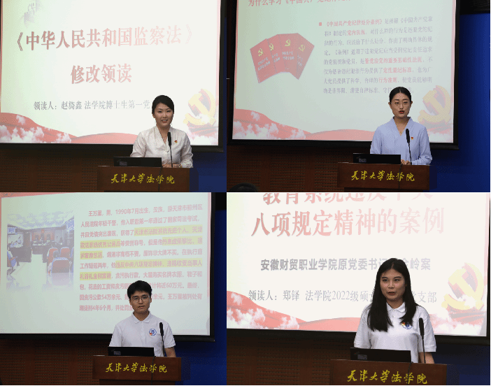 随后,四名毕业生党员代表以“纪法衔接”为主题进行领学,结合法律法规和具体案例,警示青年党员坚守法律和道德底线,不断提升廉洁自守的精神境界,以纪法为准则,走好人生每一步。