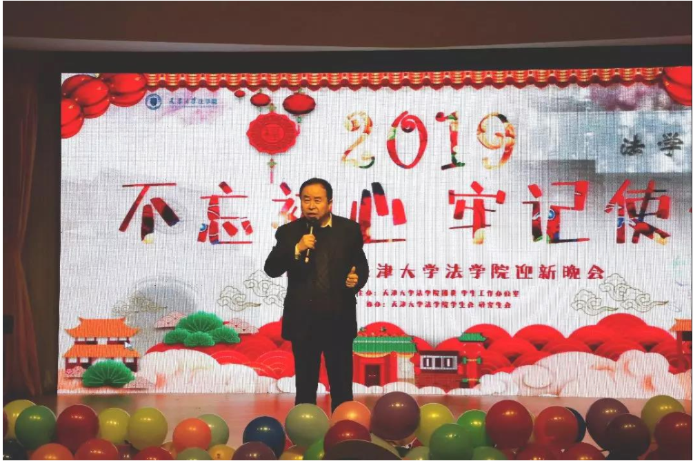 孙佑海院长为此次迎新晚会致辞。他总结了法学院2019年取得的成绩,并对今年加入天大法学院的骨干教师与2019级新生表示欢迎。他对2019级新生寄予厚望,希望大家进入大学后更加勤奋学习,正如晚会主题那样,“不忘初心、牢记使命”,练就真本领,勇担时代重任。
