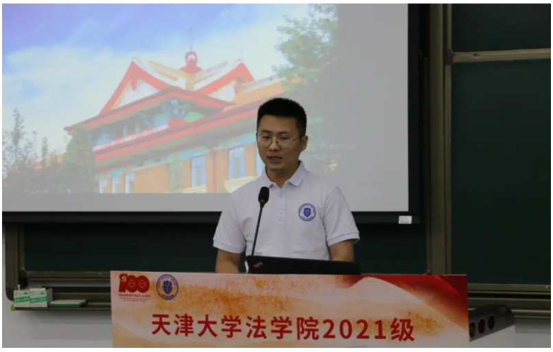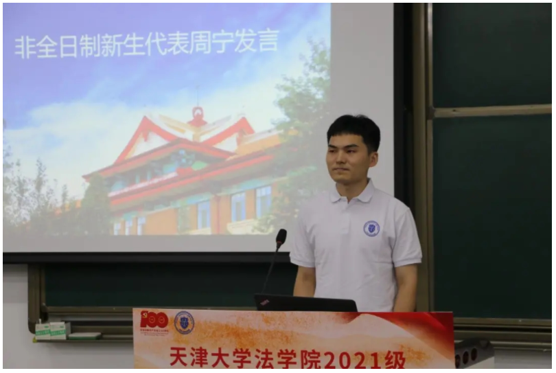 2021级非全日制新生代表周宁发言。他表示,天津大学作为百年学府,历史悠久,师资雄厚,先后培养出无数先贤。非全日制的同学从各行各业齐聚北洋,在新的人生起点上,定会珍惜机会,牢记“崇法厚德,致公天下”的院训,坚定法治信仰,主动锤炼品德,以更加优异的成绩来回报各位老师。