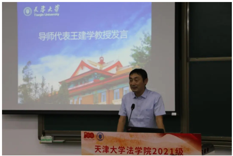 导师代表王建学教授发言。他代表法学院教师队伍欢迎各位同学加入天大法律人这个青春洋溢的大家庭,同时向同学们提出三点殷切期盼:一是坚持法律工匠精神,全力以赴,展现天大法律人的荣誉感和使命感;二是要认真学习,增长本领,追慕先贤,严以律己,不负研究生这个平凡但不平庸的称号;三是强健体魄,为理论研究和法律实践奠下坚实基础。