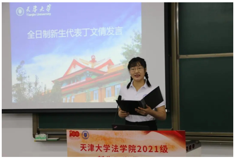 2021级全日制新生代表丁文倩发言。本科就读于天津大学化工学院的她因一堂法学辅修课与法学院结下奇妙缘分。作为天津大学太雷班的成员,法科老学长张太雷的英勇事迹使她对北洋法科怀着崇高的敬仰。在新的阶段,她定将“实事求是”的校训精神学懂、弄通、做实,怀着勇立潮头的浩气、超越前人的勇气、与时俱进的朝气,继续书写天大人“矢志创新”的不懈追求。