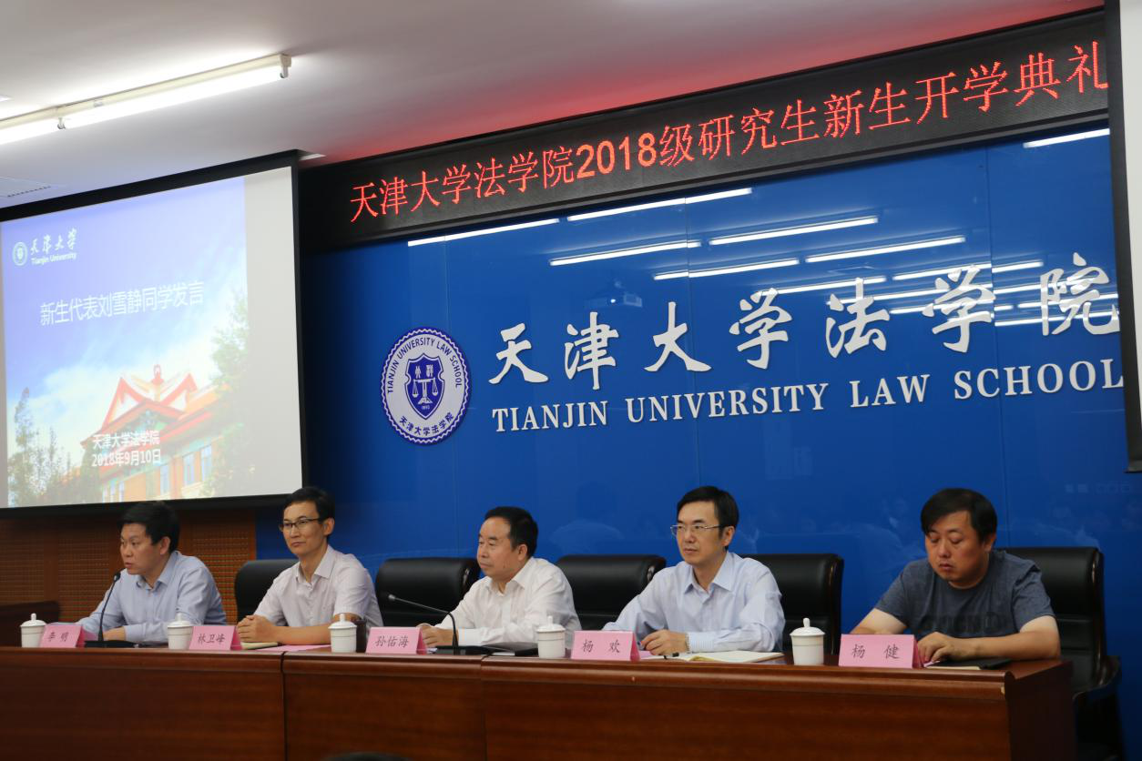 孙佑海院长讲话。他首先对 2018级硕士研究生新生的到来表示衷心祝贺,并向学院全体教师致以节日的问候。孙佑海用三句话介绍了天津大学法学院,即悠久的历史、苦干的今天和美好的明天。学院悠久的历史可追溯至1895年北洋大学堂成立之初,当时律例学门即为“四大学门”之首,北洋法科培养了革命先驱张太雷、外交家王宠惠、著名诗人徐志摩等无数先贤。学院于2015年6月17日正式复建,在复建之初确立了“高起点、入主流、有特色、国际化”的办学方针和“崇法厚德 致公天下”的院训。学院在科研成果、人才引进、学生培养、社会认可程度等方面取得了显著进步,著名民法学家杨立新教授、民诉法学家张卫平教授、刑法学家黄太云教授、戴长林教授等先后加盟天津大学法学院,良好的师资力量为学院学生的发展搭建平台、创造机会。法学院拥有美好的明天,在2018年8月16日天津大学申请新增法学一级学科博士点专家论证会上,专家一致投票通过建议新增法学一级学科博士授权点并建议学校给予全力支持。复建三年来,学院的成果有目共睹,更美好的明天等待着在座的同学们去创造。孙佑海对2018级新生提出了三点要求。第一,要认真钻研,打好基础;第二,他引用天津大学原副校长、水利部原副部长张含英的“三问”,懂么?会么?敢么?勉励同学们要懂得知识的原理,并理解运用,在工作学习中保有原则,做到真懂、真会、真敢;第三,要学法律、学法治、学法理,不仅要学习静态的法律文本,还要了解国家社会的治理模式、运行机制,更要在此过程中把握法理,认识规律。孙佑海对非全日制新生语重心长地说,非全日制的同学们更要学会珍惜时间,提高学习效率,要有规划,协调好自己的工作和学习,还要提高写作和沟通的能力。