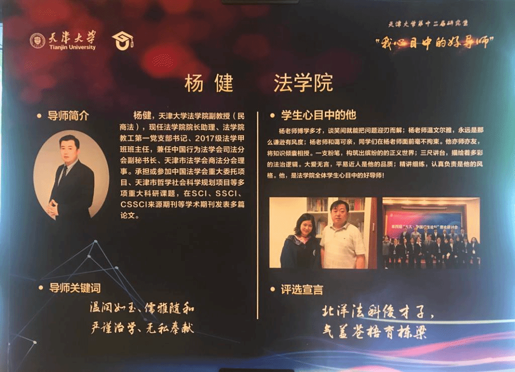 5月19日,天津大学第十二届研究生“我心目中的好导师”评选活动在北洋园校区郑东图书馆一层报告厅成功举办。法学院杨健老师在此评选中以高票荣获天津大学第十二届“我心目中的十佳好导师”荣誉称号。