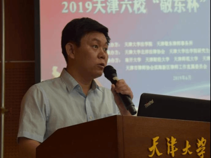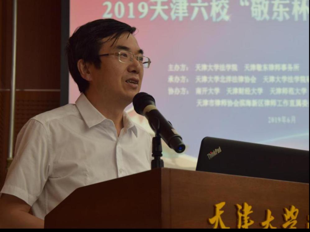天津敬东律师事务所的胡有斌主任致辞,他首先对天津大学法学院师生为本次比赛所做的准备表示感谢。并向出席大赛的各位领导嘉宾、评委老师及敬东律师事务所团队的大力支持表示感谢。