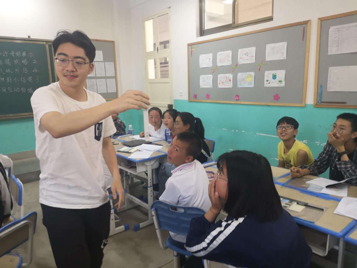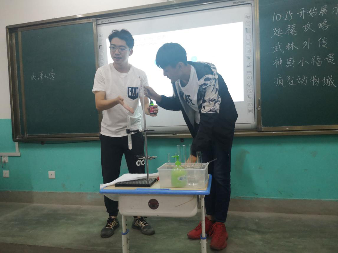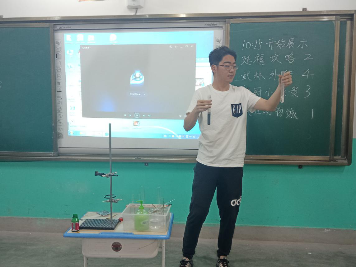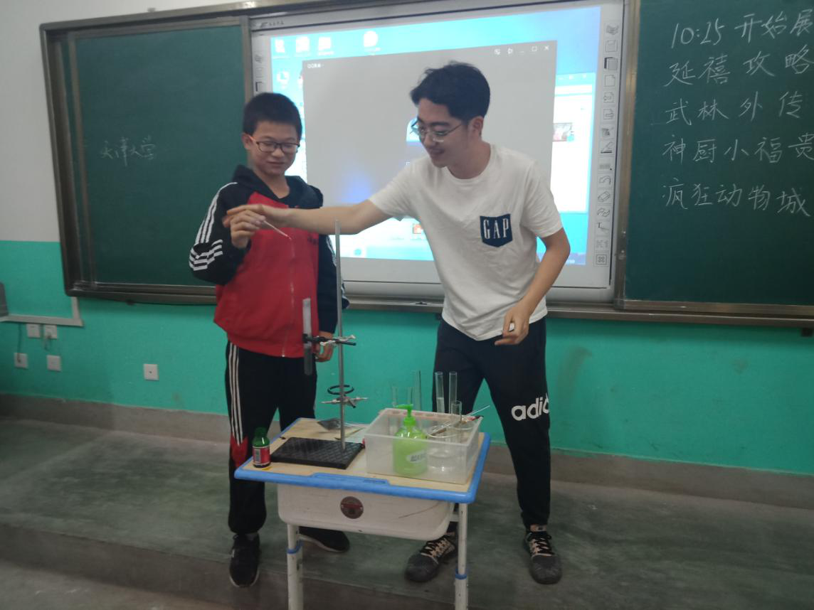 在化学课中,天津大学法学院2017级本科生冷家伟同学化身魔法师,带领同学们走进魔法的世界。碳酸钙与稀盐酸反应生成二氧化碳,双氧水加入二氧化锰产生氧气,大象牙膏实验,淀粉遇碘变蓝实验……他利用生活中常见的事物如蛋壳、淀粉、火柴等为同学们展示了化学的魅力。展示记录化学反应的视频、播放内含化学反应原理的歌曲、邀请同学一起完成简单安全的化学反应……他通过不同的授课形式让同学们在有限的时间内了解到尽可能多有趣的化学实验,帮助其记忆常见物质的化学性质,让他们对化学产生浓厚的学习兴趣。许多同学在下课后依然围绕在老师身旁,询问上课中所出现的化学反应原理。学习化学的兴趣种子在他们的心中深深埋下,希望本次课程能够作为他们学习化学的启蒙,在未来真正接触化学时,能够保持着这样一个积极开放的学习态度,在未来真正接触化学的时候,能够认真钻研,发扬创新精神,有所发现、有所创造,成为一个个“魔法师”。