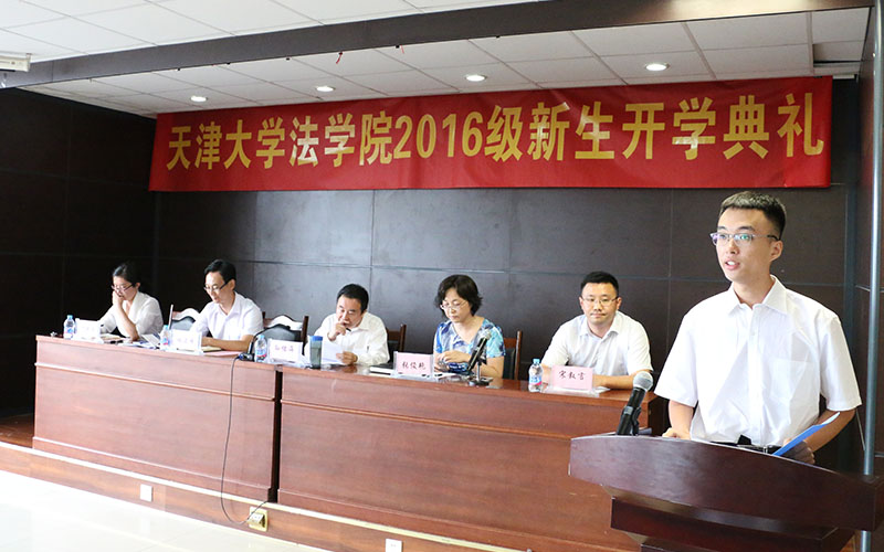 孙佑海院长作重要讲话。他首先谈到为什么要办大学。中国古代《大学》有云:“大学之道,在明明德,在亲民,在止于至善”。现代社会为大学赋予了育人、科研、社会服务和文化交融的功能,而大学最根本的功能还是育人。近现代的高等教育起源于法学。法学是正义之学、治国之学、为民之学。从事法学教育的人责任重大、使命光荣。接下来,孙院长介绍了天津大学法科的历史传承,法学院的办学方针以及复建以来所取得的各项成绩。最后,孙院长立足天大“实事求是”的校训和法学院“崇法厚德,致公天下”的院训,向同学们提出五点殷切希望:第一,要实事求是,严谨治学。要牢记水利专家、天大校友张含英先生的“懂吗?会吗?敢吗?”的三问,做一个“真懂、真会、真敢”的人;第二,要崇尚法律,信仰法治。要自觉培育法律人的坚韧性格,永远坚守法律原则;第三,要情操高尚,培育厚德。要热爱祖国、热爱学业、诚实守信,与大家和睦相处,并注重职业伦理和政治道德的养成。第四,胸怀祖国,致公天下。希望同学们树立远大目标,为祖国服务,为全人类服务。第五,拓展知识结构,打牢发展基础。在学习法学的同时,还要注意学习文学、历史、哲学、经济、政治、艺术、科技等多方面知识,努力把自己培养成为国家和人民需要的高素质法学人才。