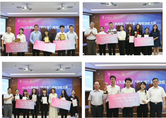 经过评委打分,现场计分,最终天津大学代表队以总分313.75分的成绩夺得一等奖,南开大学代表队、天津科技大学代表队荣获二等奖,天津财经大学代表队、天津师范大学代表队荣获三等奖。来自南开大学的刘芳芳、天津大学的窦剑聪和贾姝娴获最佳个人奖。各位嘉宾和评审为获奖选手颁发奖杯和证书并合影留念。