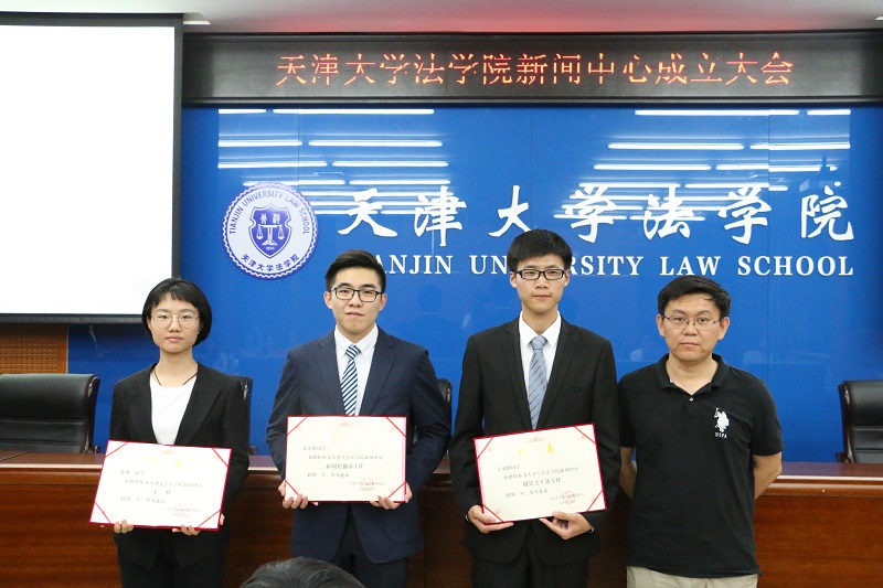 法学院新闻中心是在法学院党委的领导下,由法学院学生组成的新闻媒体类职能社团组织。中心下设中文编辑部、英文编辑部、摄影美工部和新闻传播部四个部门,以传播学院文化为己任,以服务师生为准则,以不折不扣做好新闻宣传工作为根本,贯彻执行法学院党委的各项方针政策,努力提高学院的凝聚力和社会知名度。陈姝一同学受聘为新闻中心首届主任,张芷旗、吴承麟同学为副主任。李明副书记为三位同学颁发聘书。