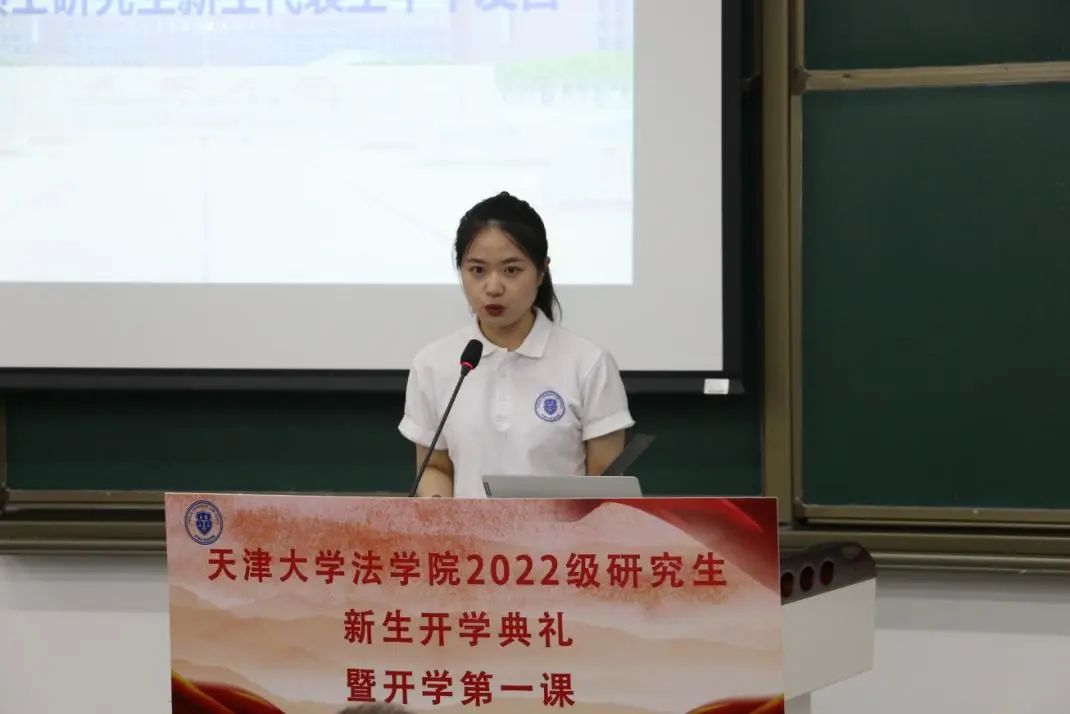 2022级全日制新生代表王芊芊发言。曾经的北洋法科是孕育国之栋梁的摇篮,现如今的天津大学对于她而言,既是一段追梦时光的记录尺,又是人生新路途的起点。她呼吁所有新生,作为朝气蓬勃的新一代北洋法律人,站在新的人生起点,要以一代代前辈贤达为引领,勇毅笃行追求真理,不畏失败追求务实,“唯有下得苦功夫,方能求得真学问”。