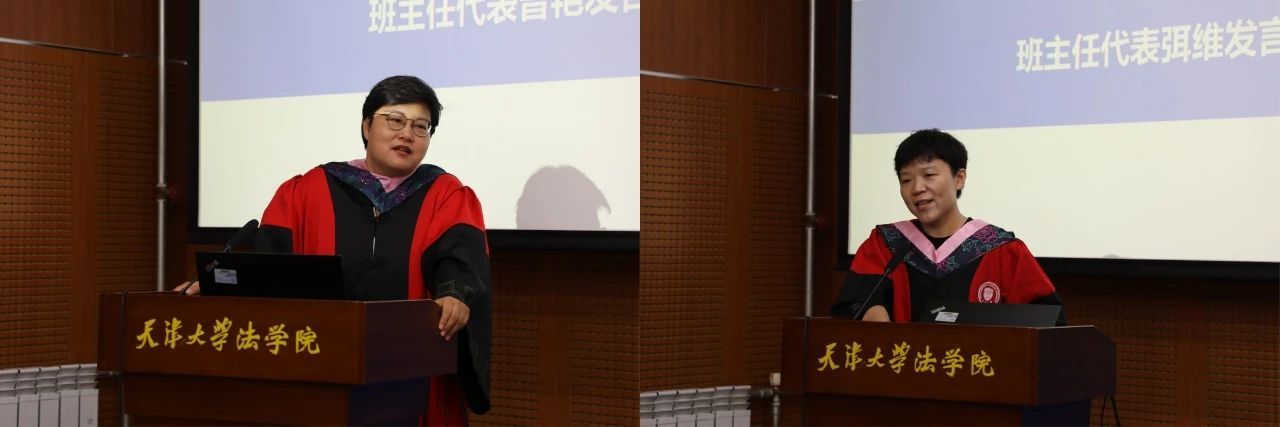 本科毕业生代表乔宝宝、刘骁同学发言。毕业后,乔宝宝同学将作为定向选调生前往安徽省纪委监委工作,刘骁同学选择前往新疆布尔津县成为一名支教老师。回顾四年的天大时光,两位同学都在天大法学院“崇法厚德,致公天下”的院训熏陶下,实现了能力和素质的蜕变。他们代表毕业生表态,未来无论身处何处,身体将永远流淌北洋法学的热血。