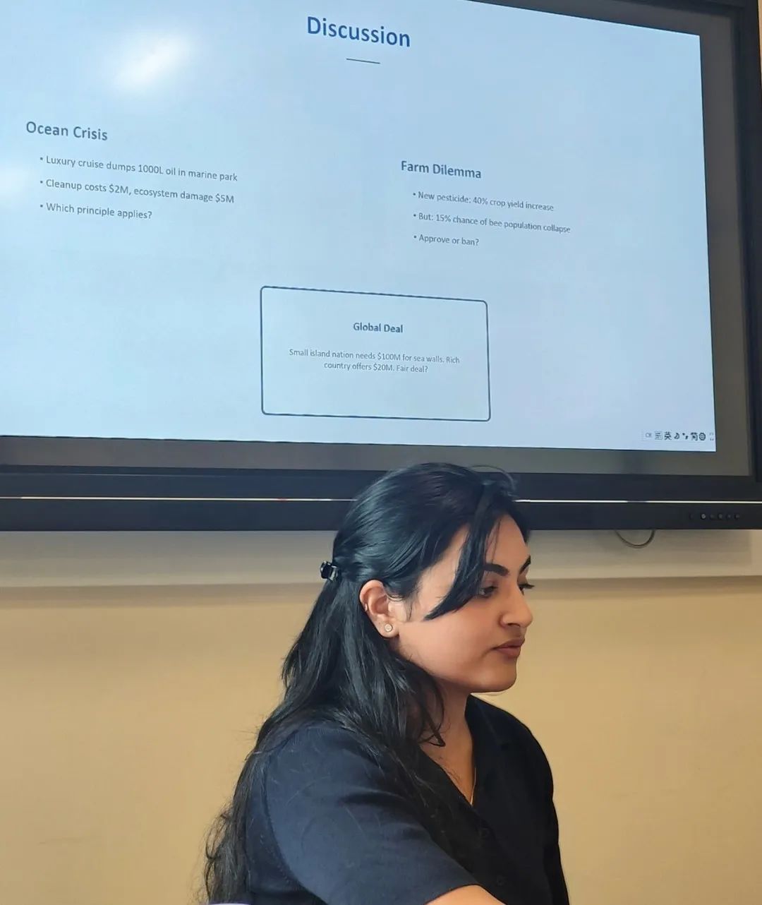 课程次日,访学团以“各国是否有义务接受气候难民”为议题开展分组辩论。正反双方围绕“气候难民的法律定义界定”“国家主权与国际人道主义义务的平衡”“全球气候治理责任与难民接收义务的关联性”等核心论点展开交锋。正方团队从“气候危机的全球性与人类共同责任”切入,结合《联合国气候变化框架公约》等国际文件,论证接受气候难民的道义与法律基础;反方团队则从“国家经济承载力差异”“难民认定标准的复杂性”等角度,提出“应建立多元协作的气候难民安置机制而非单一国家义务”的观点。辩论过程中,双方引经据典、逻辑清晰,既展现了对国际法规则的熟练运用,也体现了对全球气候治理现实问题的深度思考。双方在学术观点的碰撞中增进理解,在法律文化的交流中凝聚共识,充分彰显了天大学子的学术思辨能力与国际视野。