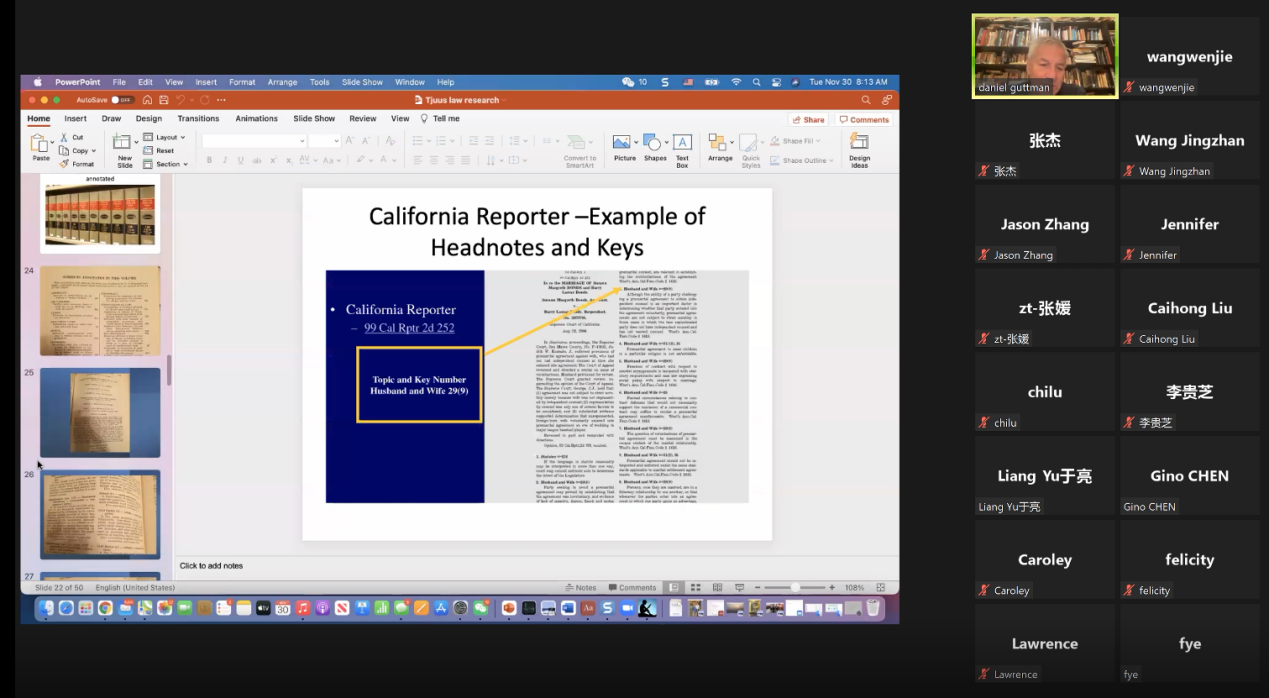 Dan Guttman教授介绍了如何对美国法律资料进行研究,分享了自身求学及工作过程中的趣事,并向同学们详细展示了研究方法与步骤。讲座中,Dan Guttman首先阐释了法律研究对于法学生的重要意义,并表示无论针对何种美国法律资料,其研究思路都是类似的。此外,在案例研究中,关注批注、关键词及注释可以帮助同学们更好地了解案件。接下来,Dan Guttman教授就美国法律工具书、法律期刊文章、司法判例及法律数据库工具等问题,同与会师生进行了分享和讨论。Dan Guttman教授最后指出,法律资料的研究是不断变化与发展的,这次讲座也仅是快速变化的法律世界的最新快照,他还鼓励学生们将这次讲座学到的基础知识转化为研究美国法律的专业技能,并期待与同学们下次的见面交流。本期讲座在轻松的互动中结束。