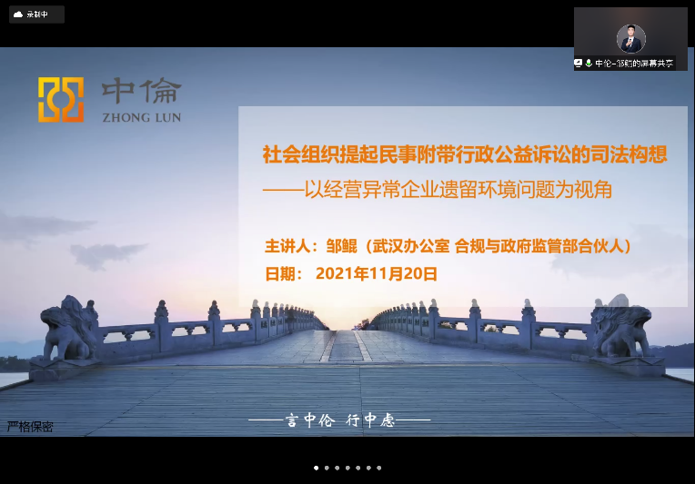 北京中伦(武汉)律师事务所廖宇程律师代表邹鲲律师以“社会组织提起民事附带行政公益诉讼的司法构想——以经营异常企业活动环境问题为视角”为主题进行分享。他分析了民事附带行政公益诉讼适格主体问题,并提出,在民事附带行政公益诉讼中应当明确预防性责任、恢复性责任、人格恢复性责任、赔偿性责任等责任。