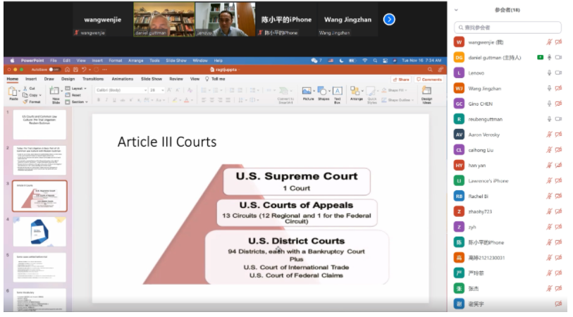 (通讯员 高晓元)11月16日晚,北洋法律大讲堂“美国普通法系列讲座”第五讲开讲。本期主讲嘉宾是美国Guttman, Buschner & Brooks律师事务所高级合伙人、埃默里法学院高级学者Reuben Guttman律师。天津大学法学院Dan Guttman教授和王绍喜副教授共同主持了讲座,来自天津大学法学院、兄弟院校的师生以及天津市各大律师事务所的律师在线上参与。