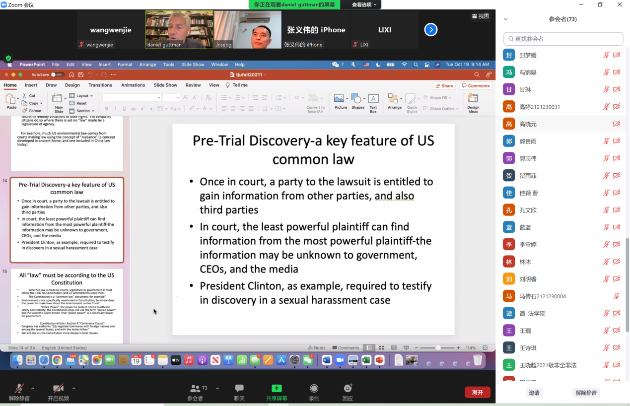 (通讯员 高晓元)10月19日晚,天津大学法学院北洋法律大讲堂美国普通法系列讲座正式开讲,天津大学法学院教授Dan Guttman作为第一讲的主讲嘉宾,为大家重点介绍了美国普通法体系及中美在司法操作层面的区别。本次北洋法律大讲堂由王绍喜副教授主持,天津大学法学院师生及天津市各大律师事务所的多名律师共70余人通过线上形式参加了本场讲座。