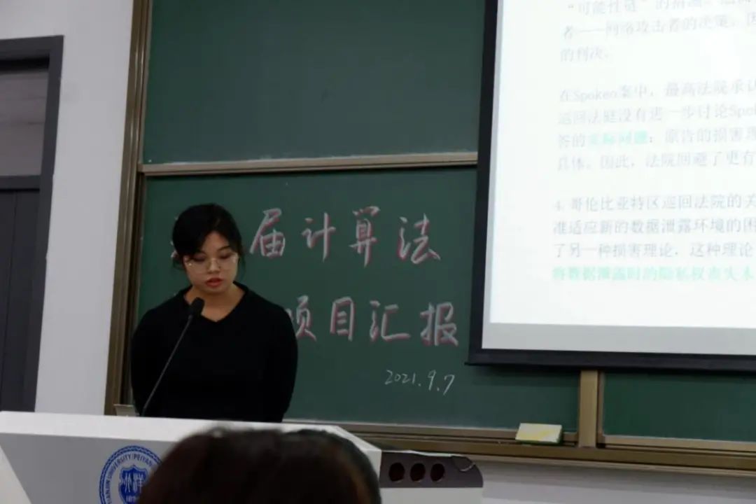 第二组为英文学术前沿组,组长由马笑荣同学担任,小组成员包括彭宇进、郭力溦、姚光启。该组的结项汇报共分为数据泄露、算法黑箱以及GDPR通用数据保护条例的适用的3个主题。首先,马笑荣就数据泄露的问题进行了介绍。她认为造成数据泄露的原因包括认识错误、系统故障及恶意犯罪,同时未来风险的不确定性使得相关案件难以认定损害事实。通过对“未来损害”理论和“数据知己”理论的介绍,她进一步说明我国的法律体系应当更多地关注数据泄露的预防而不是泄露后的实际伤害认定。其次,郭力溦同学对算法黑箱的法律规制进行了介绍。他通过黑箱的背景介绍说明了算法黑箱的不透明性及现实弊端,并指出增强算法监管是将黑箱弊端减小至最小化的最佳途径。同时,郭同学也提出了由谁承担算法黑箱监管者责任的思考问题。最后,彭宇进同学为大家介绍了GDPR的实践适用。他通过德国、奥地利、卢森堡、西班牙对于GDPR的实施措施及其与国内法的衔接说明了GDPR为成员国提供国家数据保护制度的同时,保留了一定的制度调整空间以增加法条适用性,保证了GDPR在实践中实质发挥保护作用。评审老师肯定了研究题目的新颖与前沿,希望同学们继续深入研究。