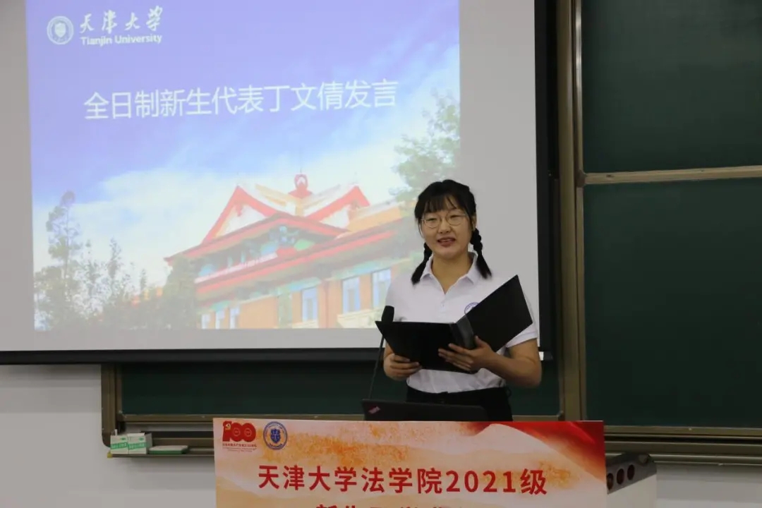2021级全日制新生代表丁文倩发言。本科就读于天津大学化工学院的她因一堂法学辅修课与法学院结下奇妙缘分。作为天津大学太雷班的成员,法科老学长张太雷的英勇事迹使她对北洋法科怀着崇高的敬仰。在新的阶段,她定将“实事求是”的校训精神学懂、弄通、做实,怀着勇立潮头的浩气、超越前人的勇气、与时俱进的朝气,继续书写天大人“矢志创新”的不懈追求。