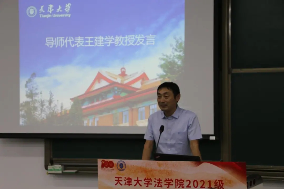 导师代表王建学教授发言。他代表法学院教师队伍欢迎各位同学加入天大法律人这个青春洋溢的大家庭,同时向同学们提出三点殷切期盼:一是坚持法律工匠精神,全力以赴,展现天大法律人的荣誉感和使命感;二是要认真学习,增长本领,追慕先贤,严以律己,不负研究生这个平凡但不平庸的称号;三是强健体魄,为理论研究和法律实践奠下坚实基础。