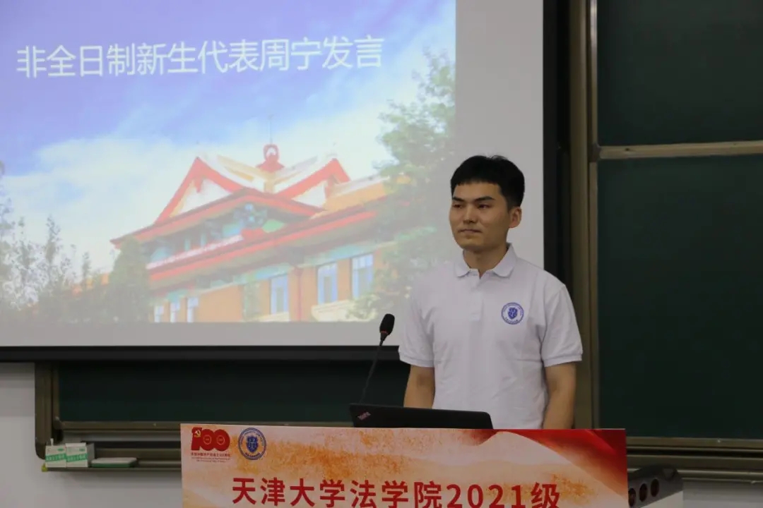 2021级非全日制新生代表周宁发言。他表示,天津大学作为百年学府,历史悠久,师资雄厚,先后培养出无数先贤。非全日制的同学从各行各业齐聚北洋,在新的人生起点上,定会珍惜机会,牢记“崇法厚德,致公天下”的院训,坚定法治信仰,主动锤炼品德,以更加优异的成绩来回报各位老师。