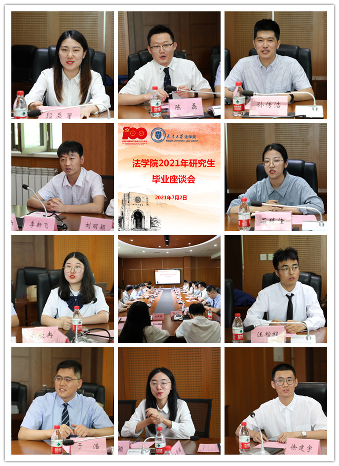 当天下午,法学院2021年研究生毕业生座谈会于学院330会议室举行。法学院院长孙佑海,党委书记杨欢,副院长杨健,党委副书记、副院长张昊,党委组织员张丹,研究生教务员杨瑷嘉,团委副书记张斯琦,辅导员付常辉出席座谈会,来自学院全日制、非全日制的10名研究生毕业生代表参加座谈会。