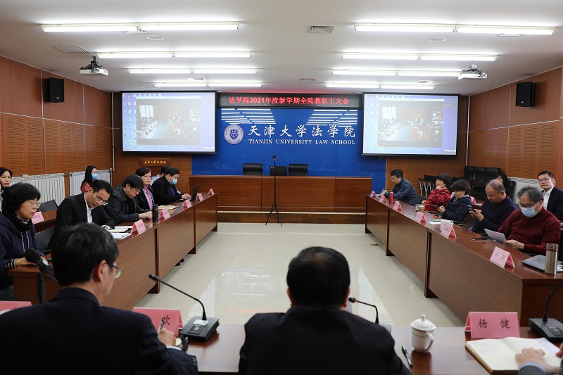 孙佑海院长从强化政治引领、本科生教学、研究生培养、科学研究、学科建设、队伍建设、国际化建设、学生工作、党建工作、合作交流与高端培训、生物安全战略研究中心等方面对2021年的重点工作进行了安排。孙院长指出,除了常规工作之外,今年学院要做好一流本科课程、市级优秀教学成果奖的培育和申报工作,推动法学教育联盟制度建设和新法科建设方案细化落实,强化培养质量监督;大力推进智库建设,在将已有基地做大做强的基础上,增设新的省部级平台;开展向建党百年献礼系列活动,落实落细学院“三全育人五育并举”实施细则。