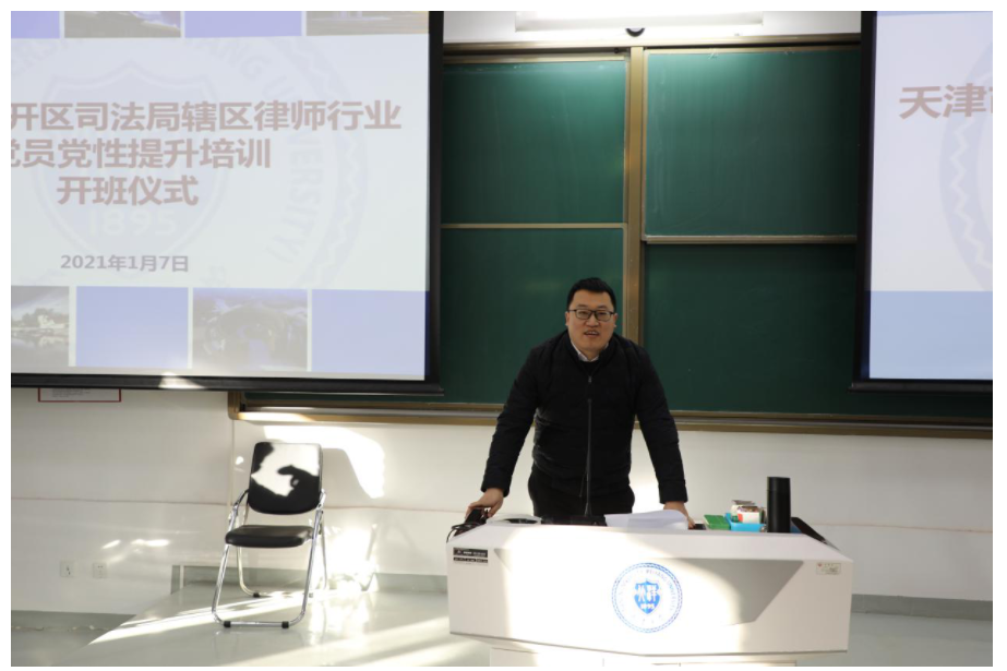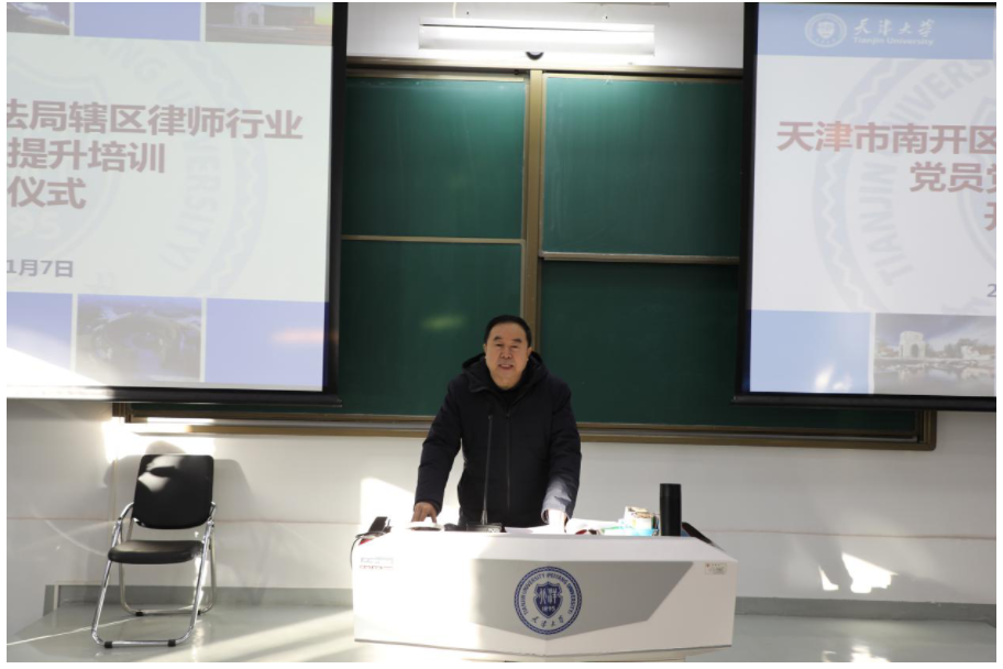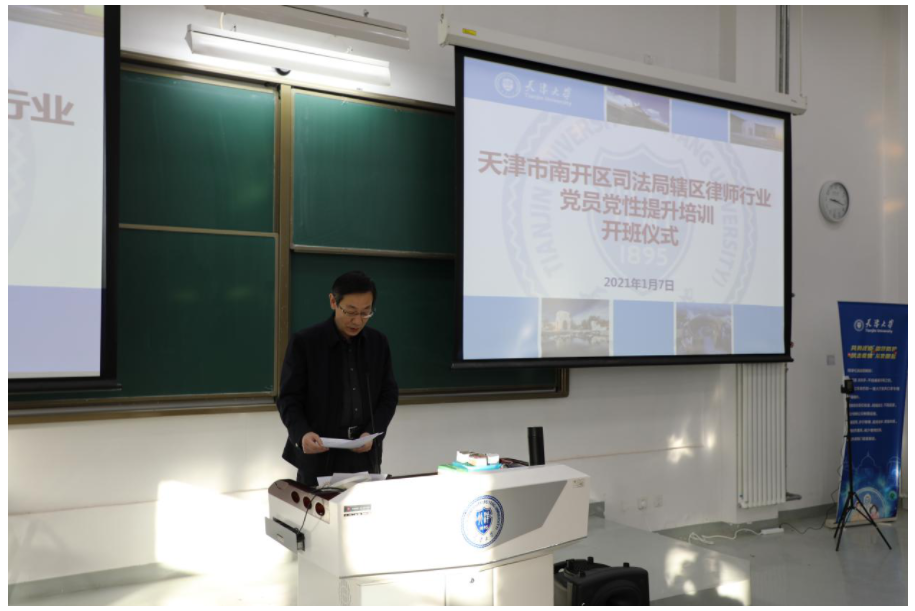 (通讯员 邵迎翔 摄影 于洋)2021年1月7日,由天津大学法学院承办的“天津市南开区律师行业党员党性提升培训班”在天津大学卫津路校区正式开班。本次培训由南开区司法局委托天津大学法学院举办。出席开班仪式的有:天津市南开区司法局党委书记、局长黄振怀,司法局律工科负责人、律师行业党委书记郑一,天津大学法学院院长孙佑海,院长助理田丽娜和来自南开区司法局辖区各律师事务所党员的全体学员。开班仪式由天津大学法学院党委副书记、副院长张昊主持。本次培训采取严格的疫情防控措施,制定了疫情防控须知和应急预案并报南开区防疫指挥部备案。