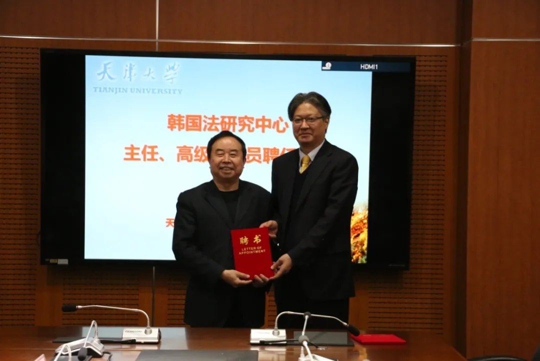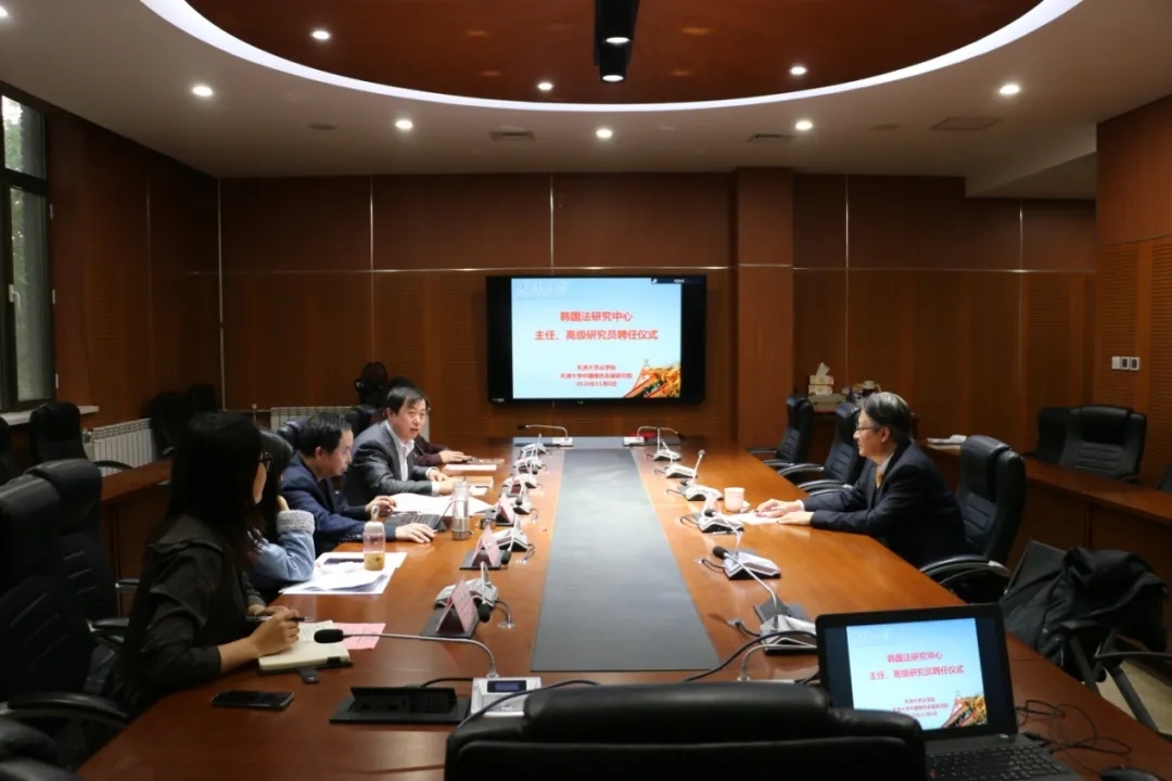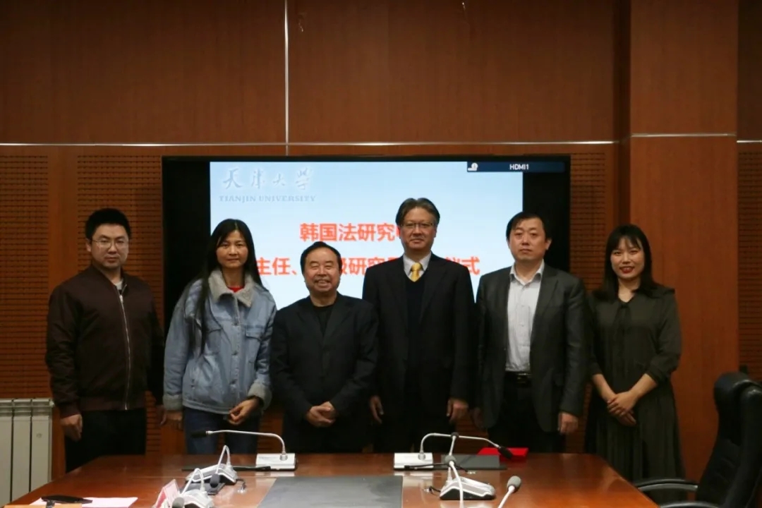 (通讯员 王文杰 摄影 李泽鹏)11月6日,天津大学中国绿色发展研究院成立韩国法研究中心,聘请韩承勋博士担任韩方主任。聘任仪式在天津大学法学院举行。天津大学法学院院长、中国绿色发展研究院执行院长孙佑海,法学院副院长杨健,中国绿色发展研究院研究员陈学敏、田亦尧,法学院科研秘书王文杰出席聘任仪式。
