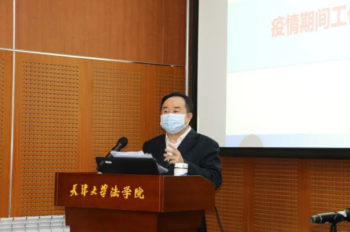 孙佑海院长讲话。他向疫情发生以来,坚守在学校疫情防控工作一线的教职员工表示衷心的感谢,向全院师生致以亲切的慰问。他指出,近几个月来,虽有疫情阻隔,但全体教师居家办公,坚守本职,按照教育部的要求和学校的工作部署,积极投身在线教学,克服了技术方面的种种障碍,深入钻研在线教学特点,精心备课授课、组织学生研讨,得到了学生们的一致好评。老师们笔耕不辍,发表了6篇CLSCI论文,CSSCI论文多篇和一本专著。学院薛杨副教授的研究报告《新型两用生物技术对我国生物安全的威胁及对策建议》还荣获第八届全国高等学校科学研究优秀成果奖(人文社会科学)青年成果奖。