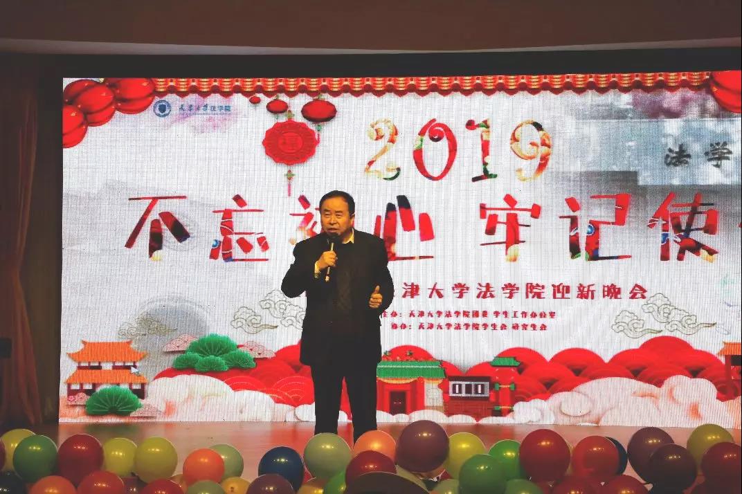 孙佑海院长为此次迎新晚会致辞。他总结了法学院2019年取得的成绩,并对今年加入天大法学院的骨干教师与2019级新生表示欢迎。他对2019级新生寄予厚望,希望大家进入大学后更加勤奋学习,正如晚会主题那样,“不忘初心、牢记使命”,练就真本领,勇担时代重任。