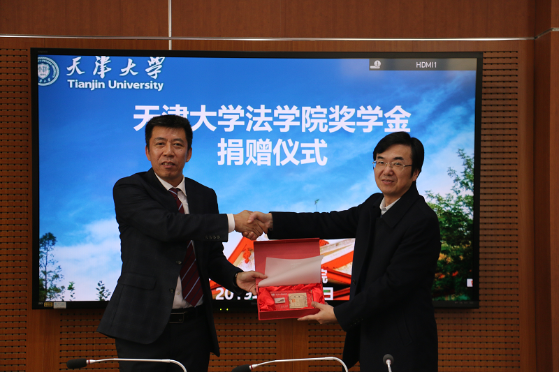 杨欢代表天津大学法学院向捐赠方赠送天津大学纪念品。