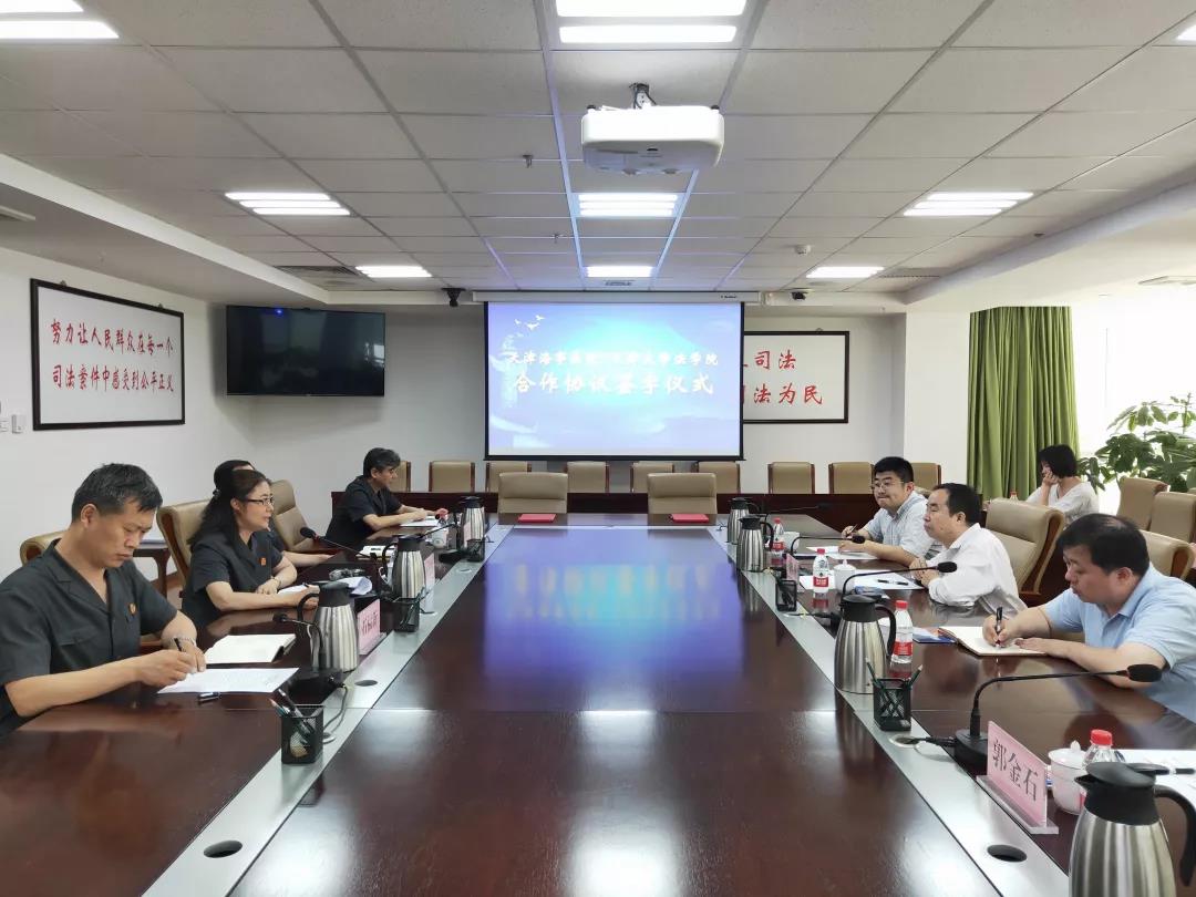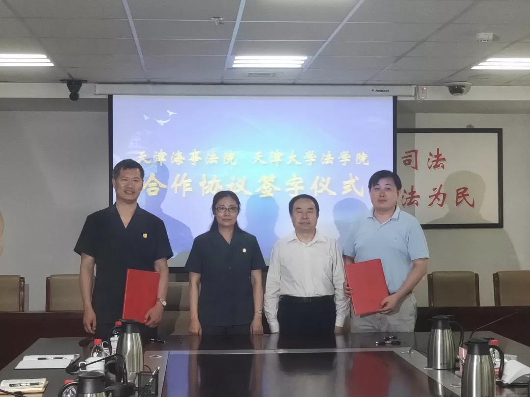 7月4日,天津海事法院与天津大学法学院举行合作协议签字仪式。出席仪式的有天津海事法院党组书记、院长李秀杰,政治部主任翟广胜,副院长石福新,研究室主任郑长伟;法学院院长孙佑海,副院长杨健,副教授于亮,办公室副主任郭金石等出席座谈。