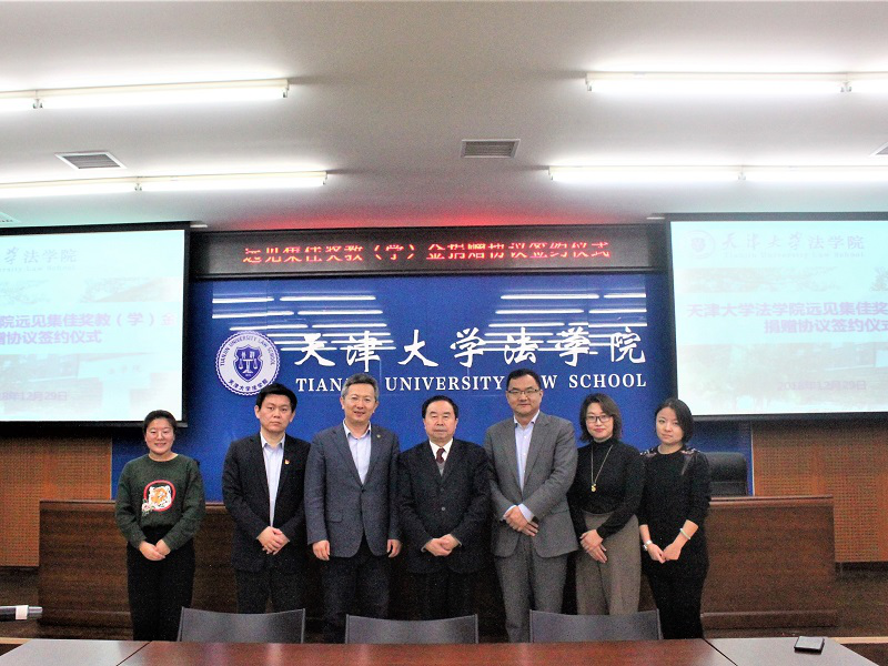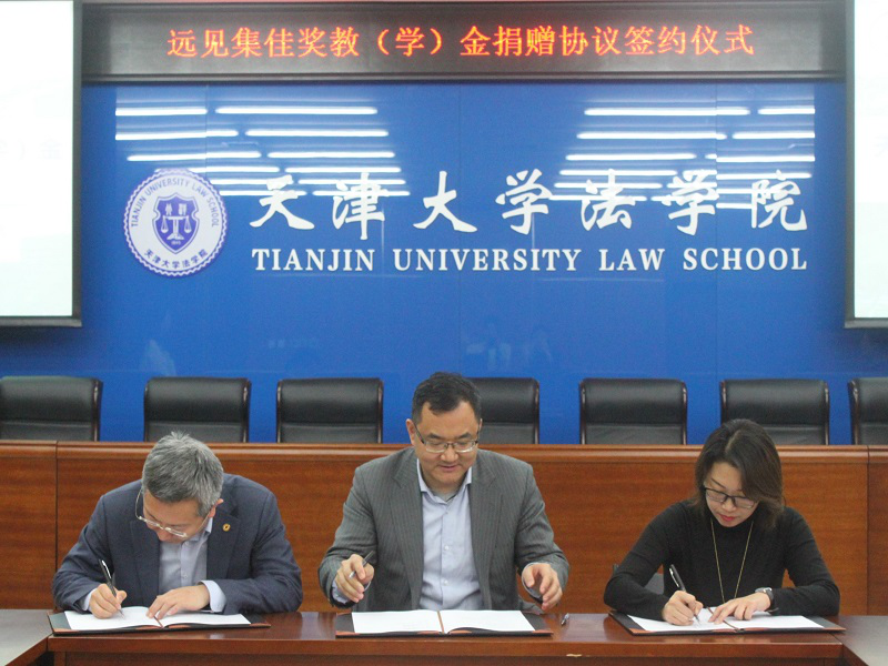 (通讯员:郭贵雨 摄影:高彤 周丽宁)2018年12月29日上午,天津大学法学院远见集佳奖教(学)金捐赠协议签订仪式在第7教学楼332会议室举行。中关村远见知识产权创新研究院理事长高巍,北京市集佳律师事务所主任李永波、闫瑾助理,天津大学校友与基金事务处处长潘峰、任杰老师和天津大学法学院院长孙佑海,副书记、副院长李明,郭贵雨老师等出席。