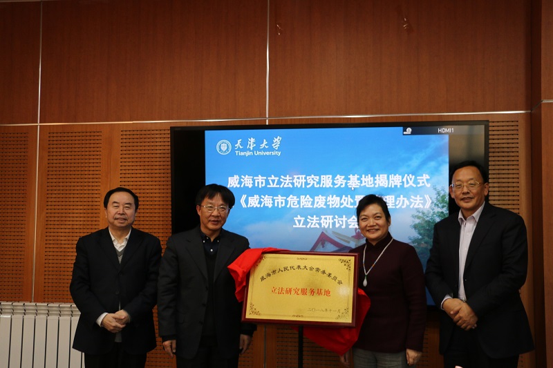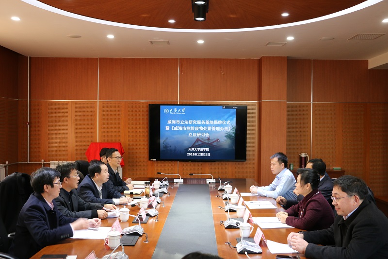 (通讯员 谈珊 摄影 王操)12月25日,威海市立法研究服务基地揭牌仪式暨《威海市危险废物处置管理办法》立法研讨会在天津大学法学院举行。威海市人大常委会张竞副主任、威海市人大常委会法工委张吉军主任、威海市司法局于国胜副局长、天津大学副校长张凤宝、天津大学法学院院长孙佑海教授、天津大学法学院党委书记杨欢、天津大学法学院副院长林卫峰、天津大学法学院张建伟教授以及师生共计二十余人出席了会议。