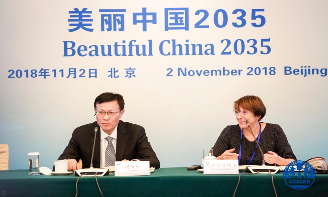 天津大学中国绿色发展研究院作为“2035环境质量改善目标与路径”政策建议课题承办单位,与德国国际合作机构积极合作,于2018年11月2日在北京钓鱼台国宾馆一起承办了国合会“美丽中国2035”主题论坛。该论坛由天津大学中国绿色发展研究院名誉院长、国合会特邀顾问胡保林先生和国合会委员、德国环境署原署长克劳次贝格尔女士联合主持。天津大学法学院院长、中国绿色发展研究院执行院长孙佑海教授以及天津大学法学院施珵讲师、谈珊讲师一同出席。国合会委员、交通运输部总工程师周伟,国合会委员、日本环境卫生中心理事长南川秀树,美国环保署西南太平洋地区原幕僚官、高级政策咨询师高景仪女士,全国人大常委会委员、中国科学院科技战略咨询研究院副院长王毅先生、国合会特邀顾问、国家应对气候变化战略研究和国际合作中心原主任李俊峰研究员,国合会委员、韩国环境工业与技术研究院原院长、韩国首尔国立大学教授尹丞準,荷兰环境评估机构全球和欧盟展望高级项目专家杨贝克先生、生态环境部与经济政策研究中心俞海研究员和国家信息中心李继峰先生等共计约40名的中外委员、国合会特邀顾问、观察员以及专家出席本次论坛。