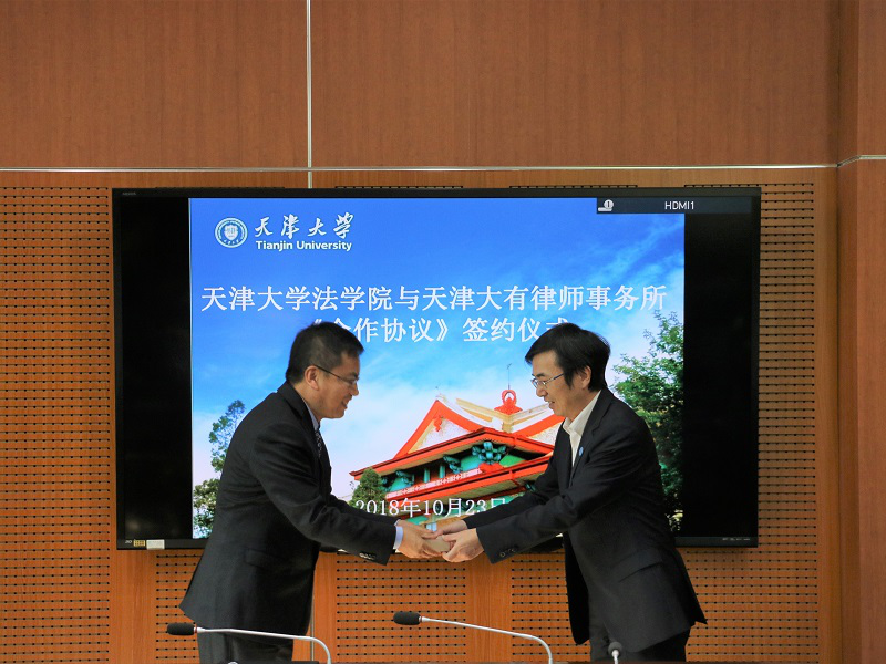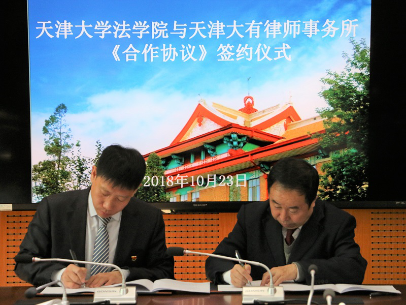 (通讯员:郭贵雨 高彤 摄影:周丽宁)2018年10月23日上午,天津大学法学院与天津大有律师事务所签订合作协议。天津大有律师事务所主任肖剑,管委会主任李坤,监事会主席王健,副主任孙艳春和天津大学法学院院长孙佑海,党委书记杨欢,党委副书记、副院长李明和党政办公室郭贵雨等出席。