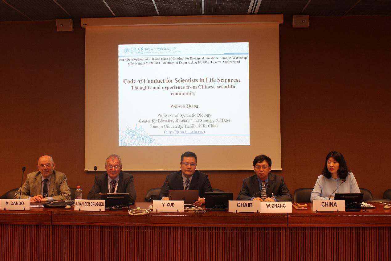 本站讯(通讯员薛杨宋洁)为进一步推动中国与巴基斯坦代表团在第八次审议大会上递交的科学家行为准则(范本),在今年6月联合国《禁止生物武器公约》天津研讨会议所达成共识的基础之上,更为广泛地听取和吸收各缔约国组织和生物科学家的建议,应外交部邀请,天津大学生物安全战略研究中心于8月10日下午在日内瓦万国宫举办边会,中心主任张卫文教授作为边会主席及发言人主持会议,中国外交部军控司吕晓东副处长代表中国政府出席,并对边会表示支持。此外,天津大学法学院、生物安全战略研究中心薛杨博士,荷兰皇家科学院van der Bruggen博士,英国布拉德福德大学Dando教授作为发言人参与会议。此次边会受到各缔约国广泛关注,近90名各国代表及专家前往聆听。
