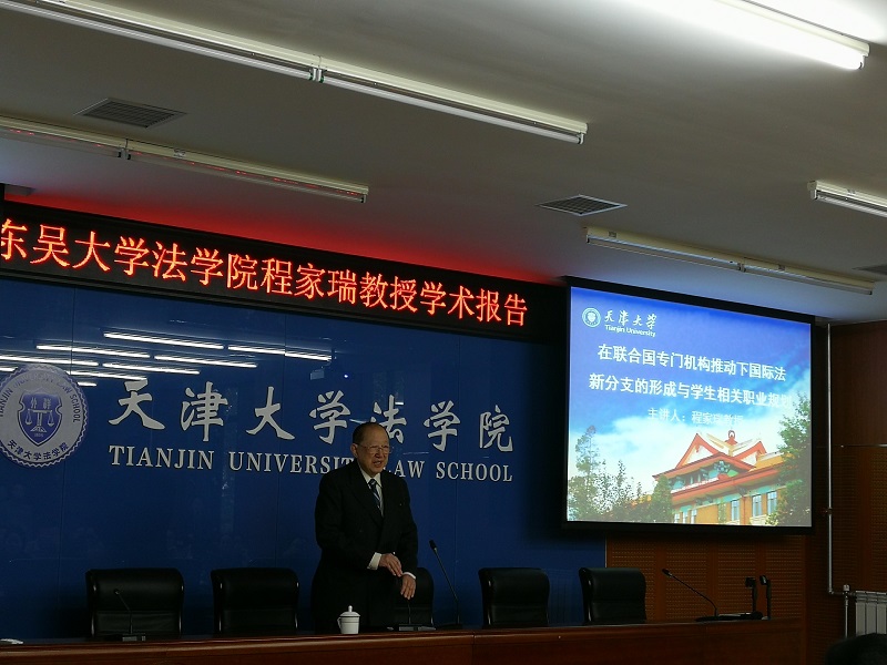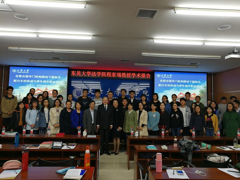 本站讯(通讯员 蓝蓝)2017年10月20日下午,东吴大学法学院程家瑞教授到访天津大学法学院,为学生们作了题为《在联合国专门机构推动下国际法新分支的形成与学生相关职业规划》的学术报告,法学院师生共70余人参加了此次报告会。