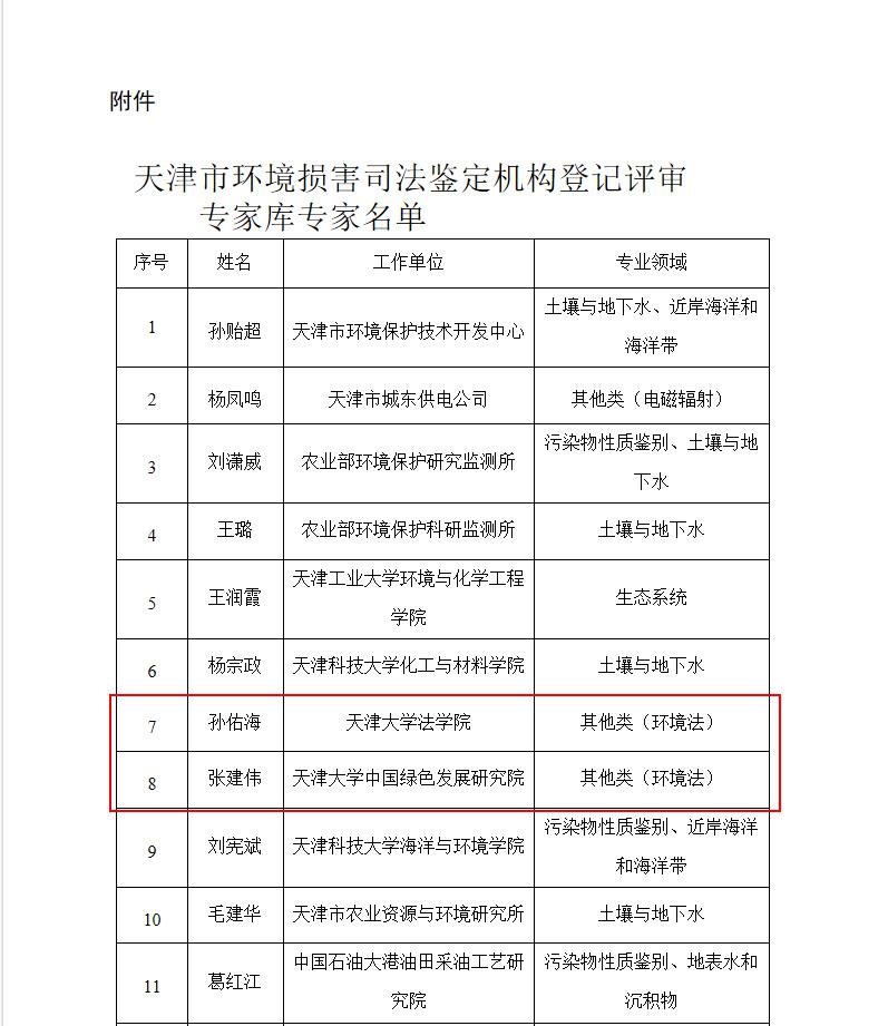 法学院院长、天津大学中国绿色发展研究院执行院长孙佑海教授、中国绿色发展研究院副院长张建伟教授通过遴选,纳入市环境损害司法鉴定机构登记评审专家库。