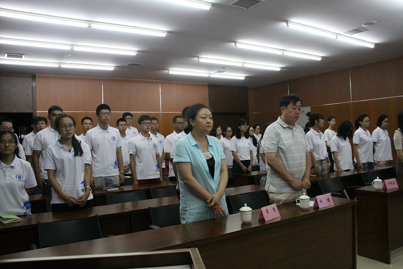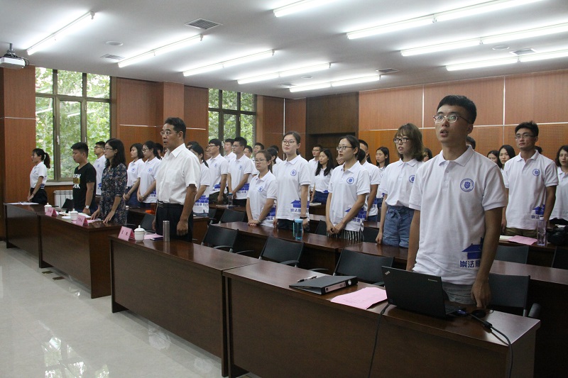 本站讯(通讯员 郭金石)8月26日下午,在嘹亮的国歌声中,法学院2017级新生开学典礼在第七教学楼332会议室隆重举行。法学院院长孙佑海,副书记、副院长赵成志,副院长林卫峰、蓝蓝,教授代表吕凯,17级甲班班主任杨健,17级乙班班主任常慧,法学院党政办公室主任于艳春,辅导员高仓健、张斯琦,以及学院全体本科和研究生新生出席典礼。