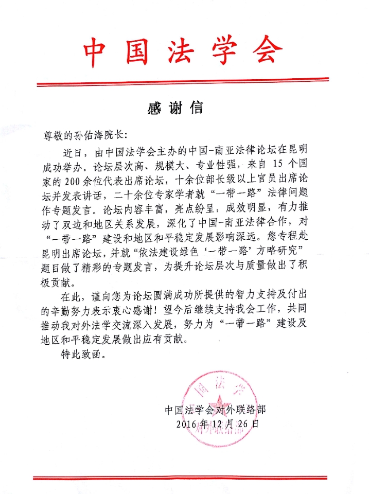 近日,天津大学法学院收到中国法学会的来信,感谢我院孙佑海院长应邀专程赴昆明,出席中国法学会主办的“中国-南亚法律论坛”,并以“依法建设绿色‘一带一路’方略研究”为题作了精彩的专题发言,为提升论坛层次与质量做出了积极贡献。以下是中国法学会的来信全文。